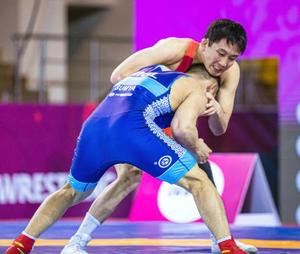 男子フリー74キロ級 初戦でモンゴル選手と対戦する乙黒圭祐=アルマトイ(保高幸子氏撮影・共同)